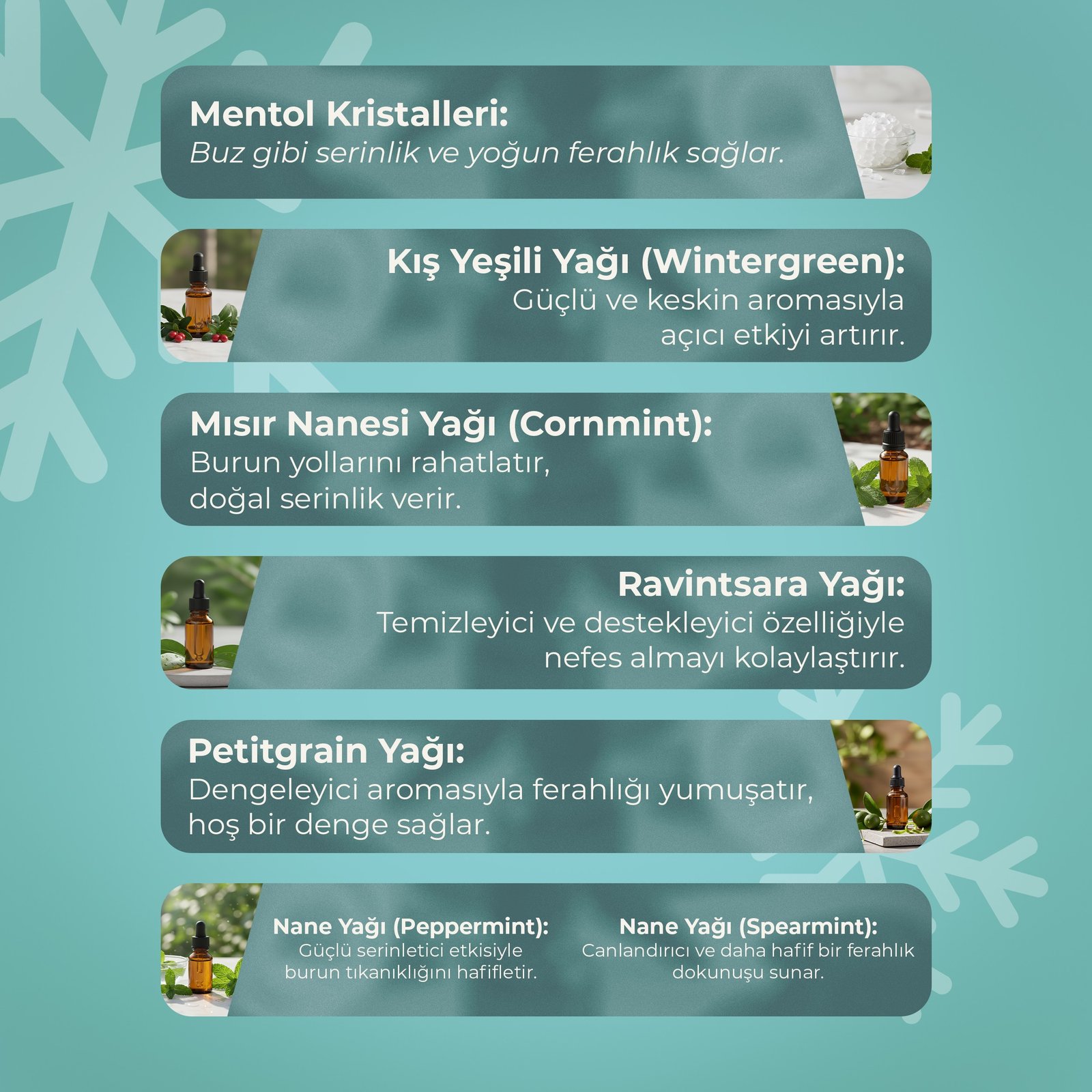 • Menthol Crystals → nefes açıcı, serinlik, zihinsel uyanıklık